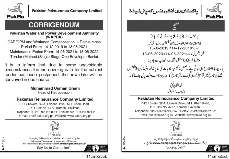 Corrigendum Pakistan Water and Power Development Authority WAPDA_26 Oct 2019