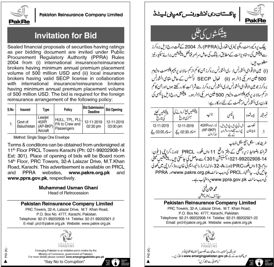 Invitation for Bids for Foreign Reinsurance Arrangement for Govt of Balochistan Learjet_26 Oct 2019