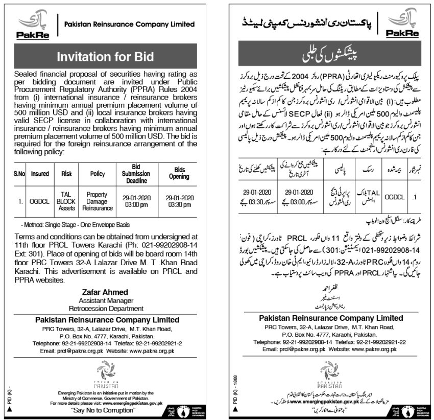 Invitation for Bids for Foreign Reinsurance Arrangement of OGDCL TAL Block Assets_30 Dec 2019