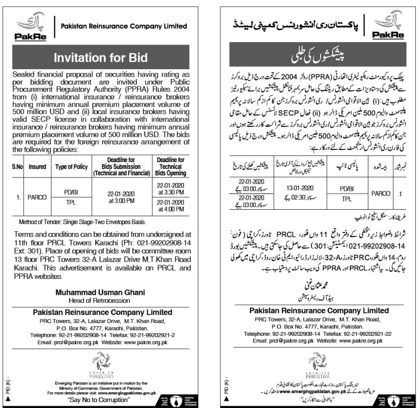 Invitation for Bids for Foreign Reinsurance Arrangement of PARCO PD BI TPL Policies_30 Dec 2019