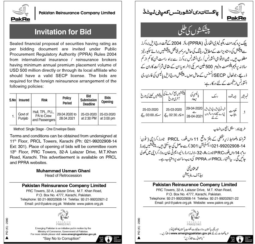 Invitation of Bid Govt of Punjab Hull TPL PLL PA To Crew Passenger Policy_19 02 2020
