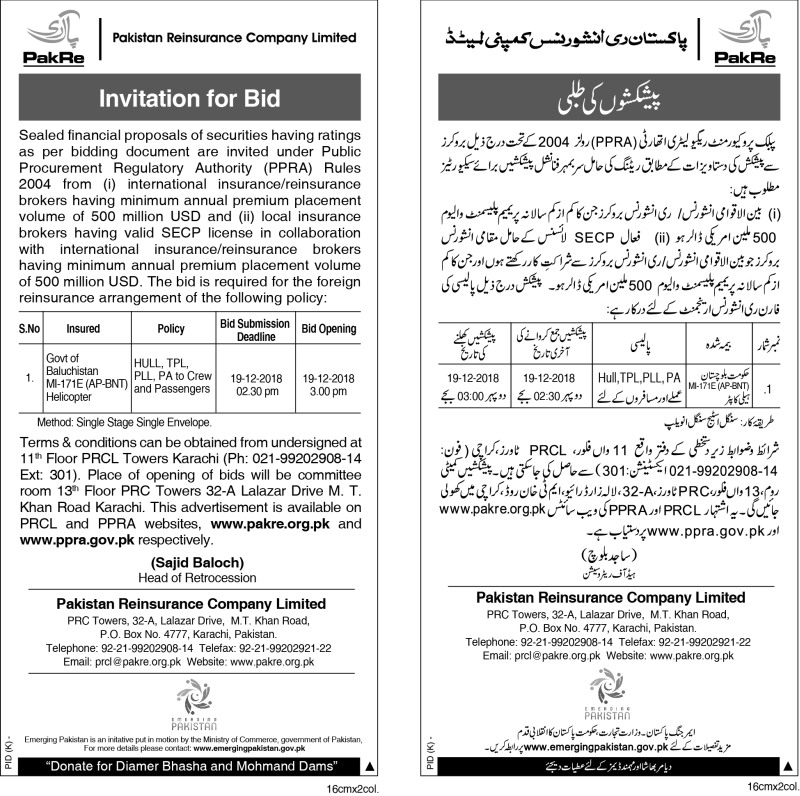 Invitation of Bids for foreign reinsurance arrangement of Govt of Balochistan M171E_20 Nov 2018