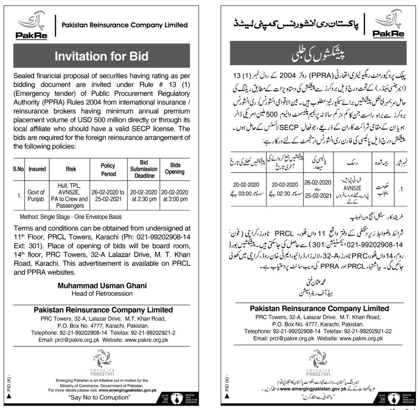 Invitation of Bids for Foreign Reinsurance arrangement of Govt of Punjab Policy_09 Feb 2020