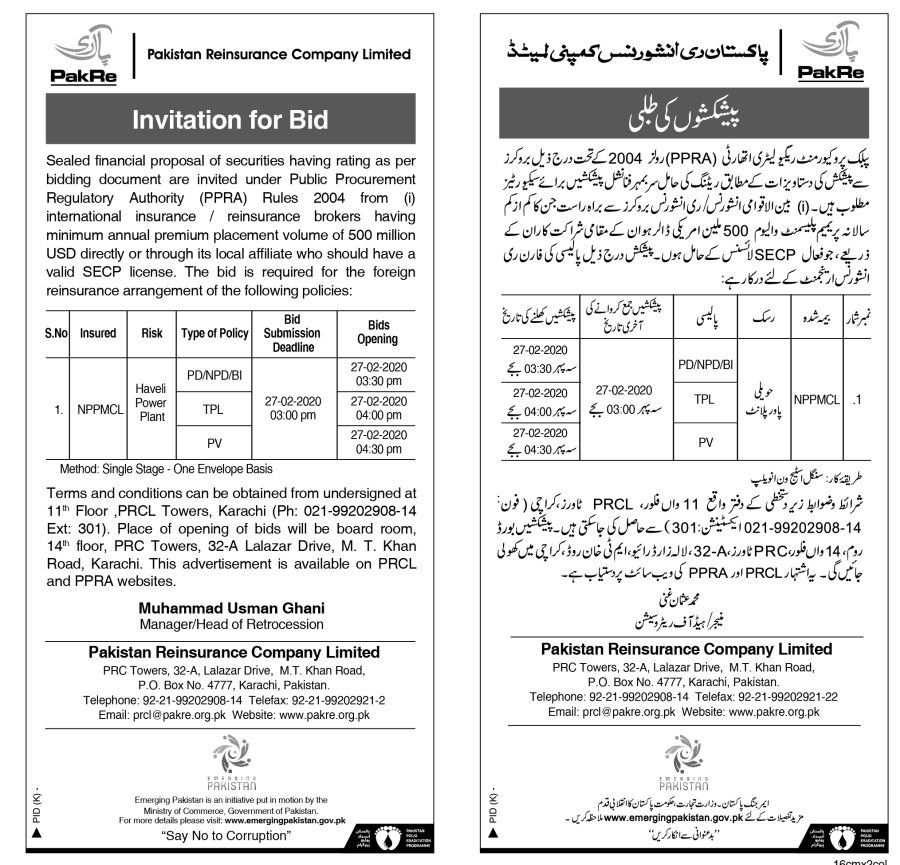 Invitation of bids for foreign reinsurance arrangement of NPPMCH Haveli Power Plant_25 01 2020