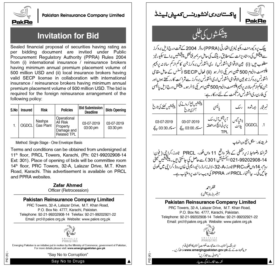 Invitation of Bids for Foreign Reinsurance arrangement of OGDCL Nashpa Gas Plant policy_18 06 2019