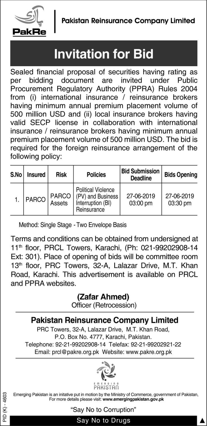 Invitation of Bids for foreign Reinsurance arrangement of PARCO Assets Policies_14 June 2019