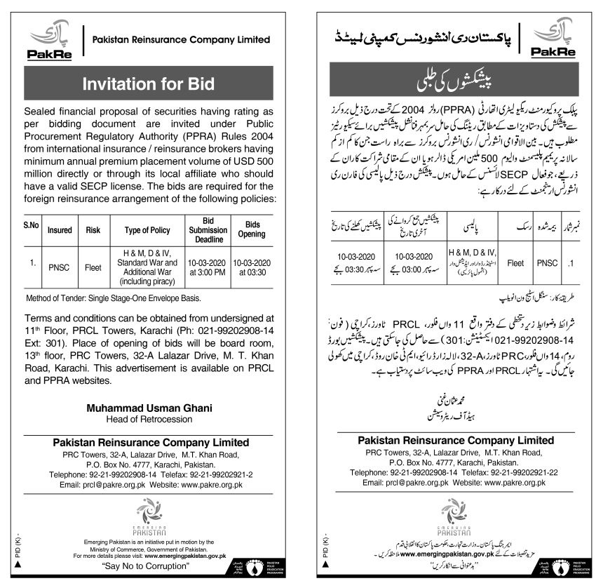 Invitation of Bids for foreign reinsurance arrangement of PNSC Fleet Policy_09 Feb 2020