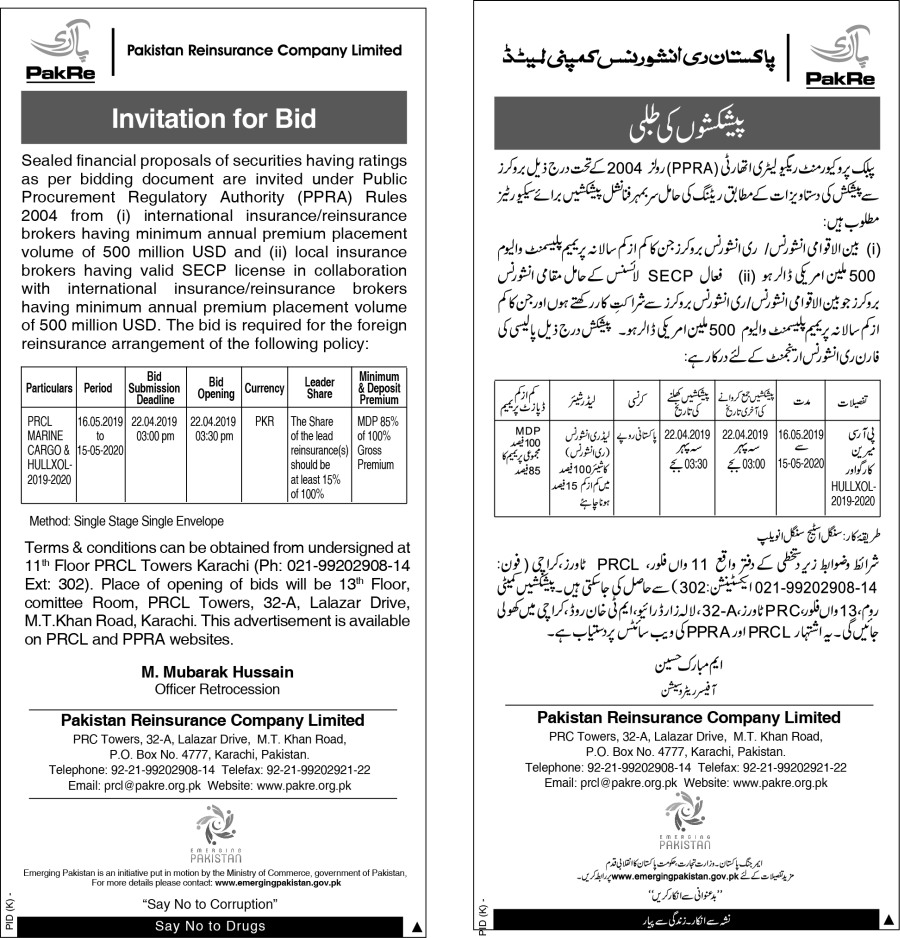 Invitation of Bids for Foreign Reinsurance Arrangement of PRCL Marine Cargo & Hull XOL_01 Apr 2019