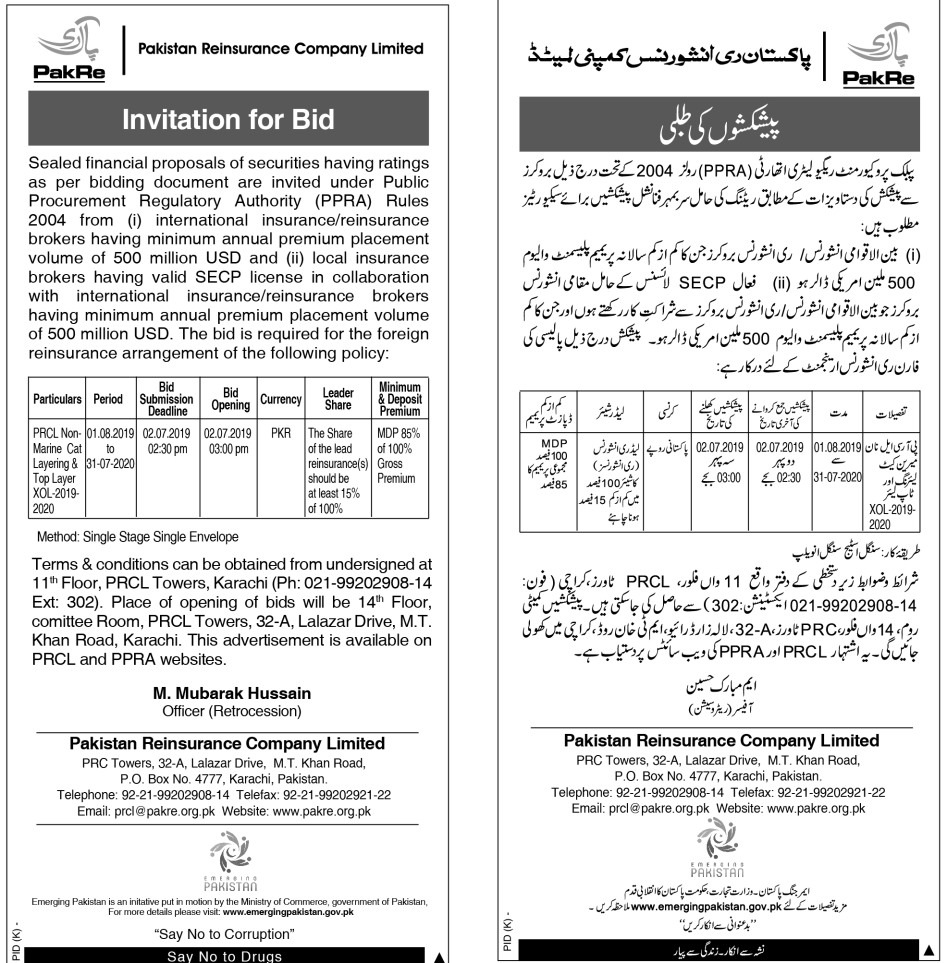 Invitation of Bids for Foreign Reinsurance arrangement of PRCL Non Marine CAT Layering & TOP XOL