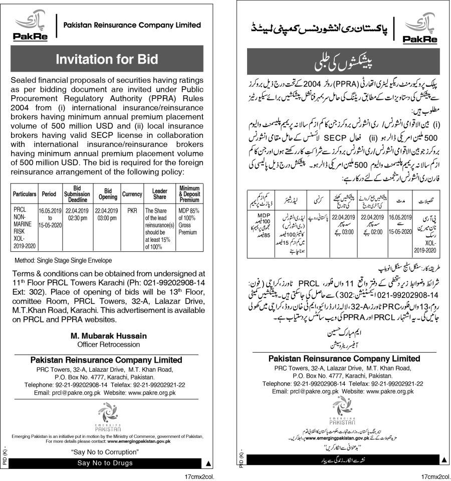 Invitation of Bids for Foreign Reinsurance Arrangement of PRCL Non Marine Risk XOL_01 Apr 2019