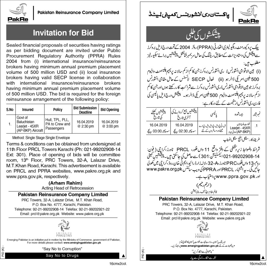 Invitation of Bids for Foreign Reinsurance of Govt of Balochistan Learjet_01 Apr 2019