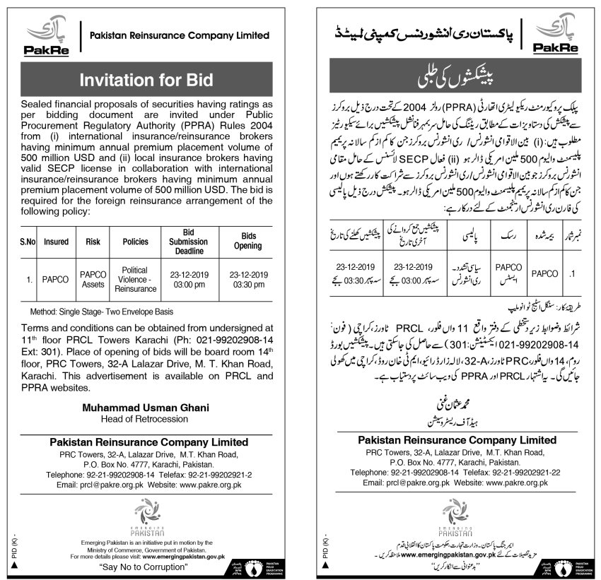 Invitation of Bids for Foreign Reinsurance of PAPCO Assets Policy_23 Nov 2019