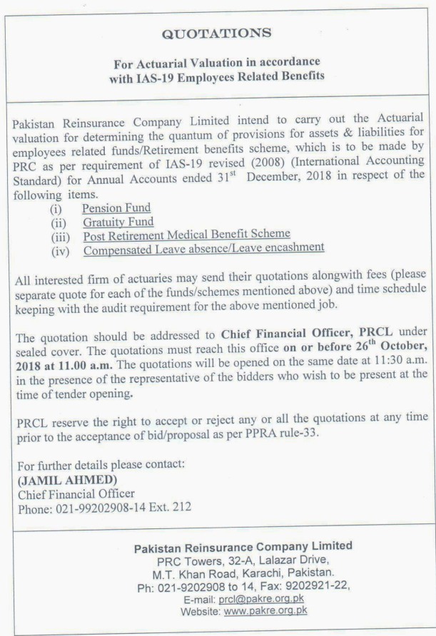 Quotations for Acturial Valuation in accordance with IAS-19 Employees related Benefits