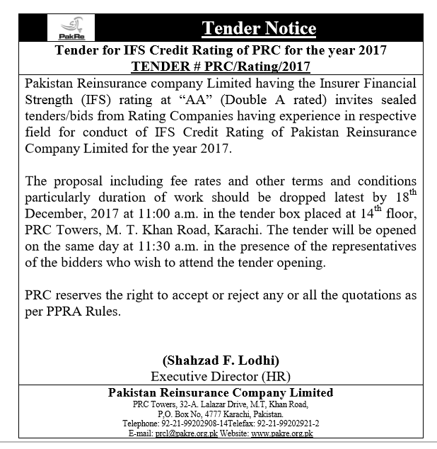 Tender notice for IFS Credit Rating of PRCL_30th Nov 2017