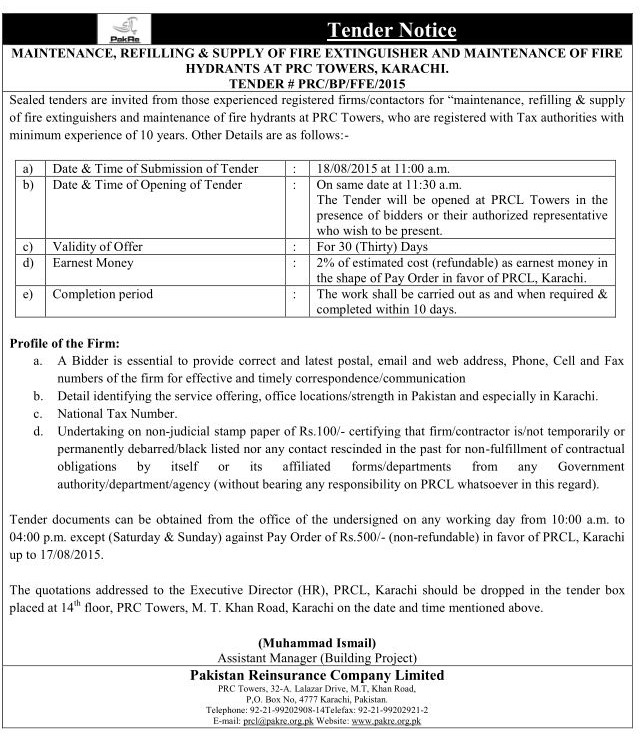 Tender notice for maintenance and refilling of fire extinguishers & hydrant