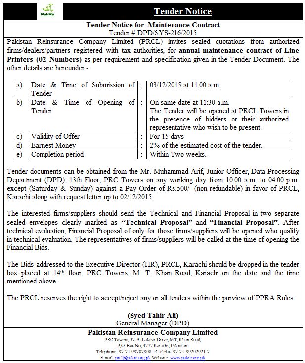 tender notice for maintenance contract for Line Printers_19 Nov 2015