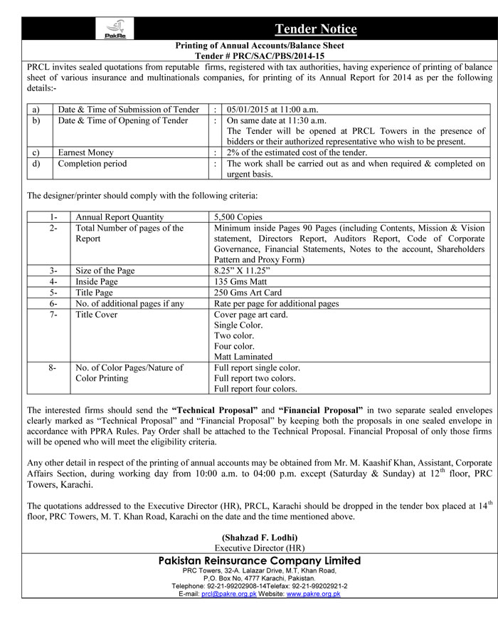 Tender notice for printing of Annual Accounts/Balance Sheet