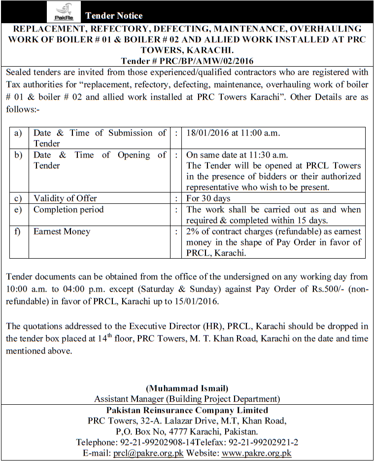 Tender notice for replacement, refectory, defective maintenance of boiler_30 Dec 2015