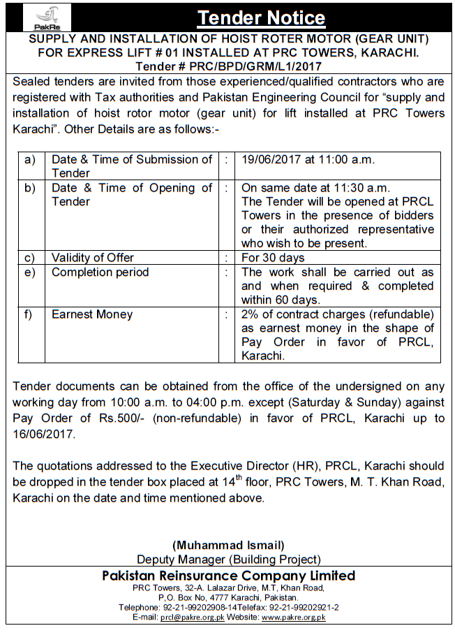 Tender notice for supply and installation of hoist rotor motor_30 May 2017