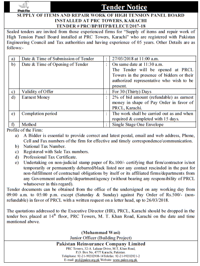 Tender notice for supply and repair work of high tension panel board
