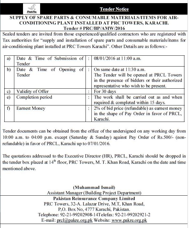 Tender notice for supply of spare parts and consumable material for AC plant_22 Dec 2015