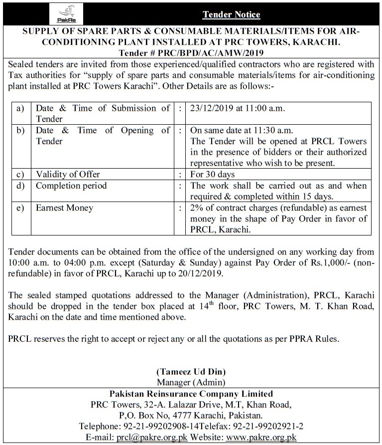 Tender Notice for Supply of Spare Parts Consumable Items for AC Plant_05 Dec 2019