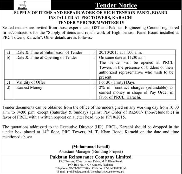 Tender notice for supply of items and repair work of high tension panel board