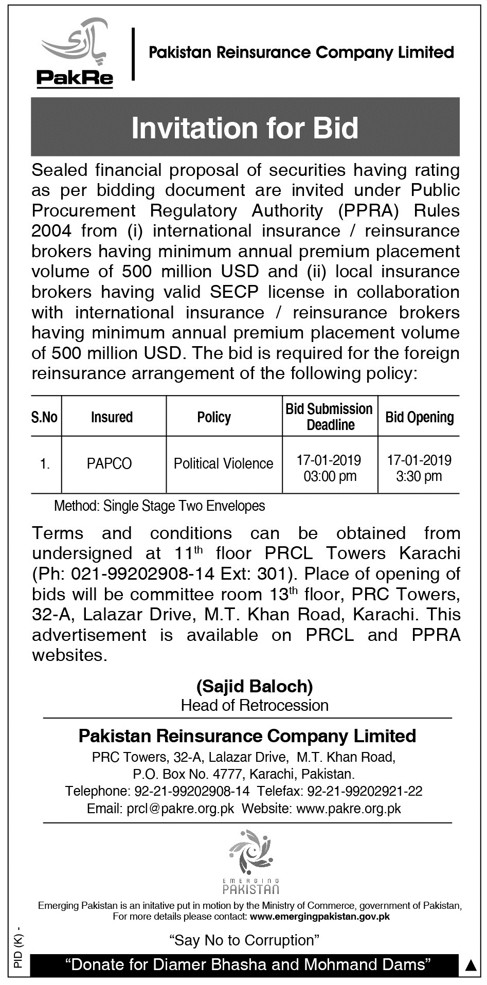 Invitation of Bids for Foreign Reinsurance Arranagement of PAPCO Political Violence Policy