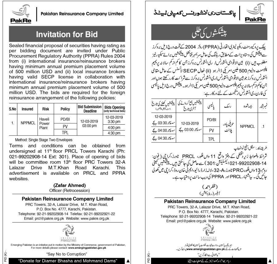 Invitation of Bids for Foreign Reinsurance Arrangement of Haveli Power Plant