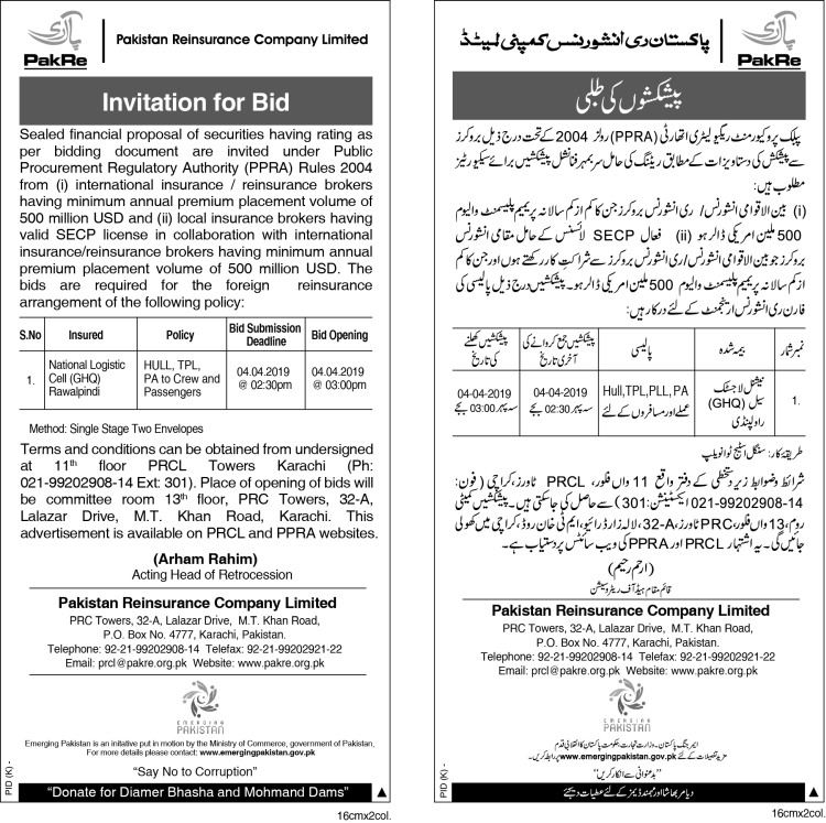 Invitation of Bids for Foreign Reinsurance Arrangement of National Logistics Cell Policy_1132019