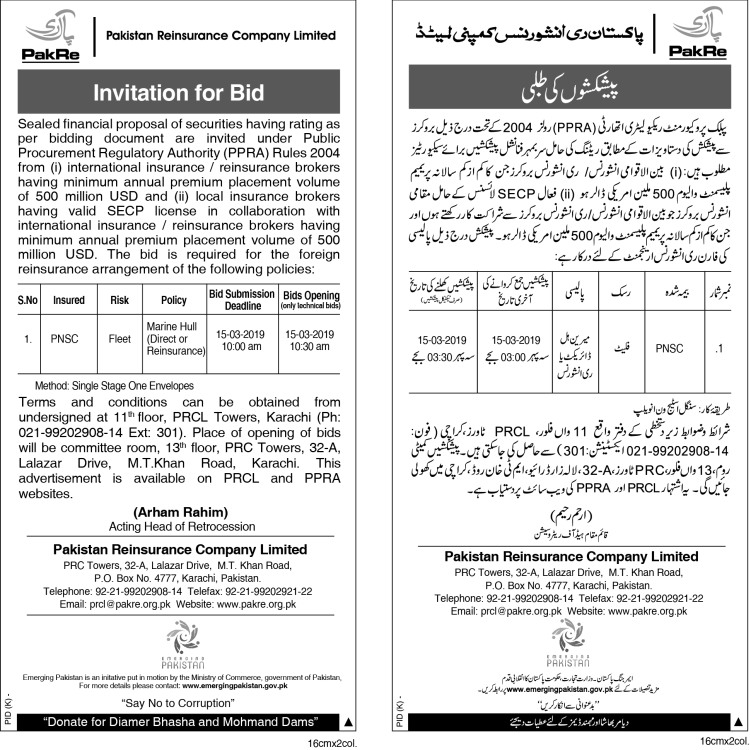 Invitation of Bids for Foreign Reinsurance Arrangement of PNSC Fleet Policy