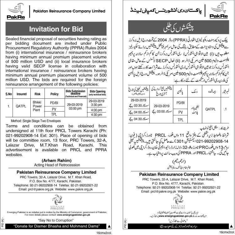 Invitation of Bids for Foreign Reinsurance Arrangement of QATPL Policy_11 03 2019