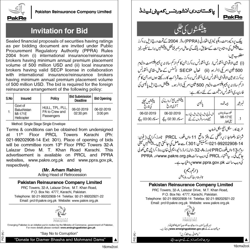 Invitation of Bids for Foreign Reinsurance of Govt of Baluchistan M171E Helicopter