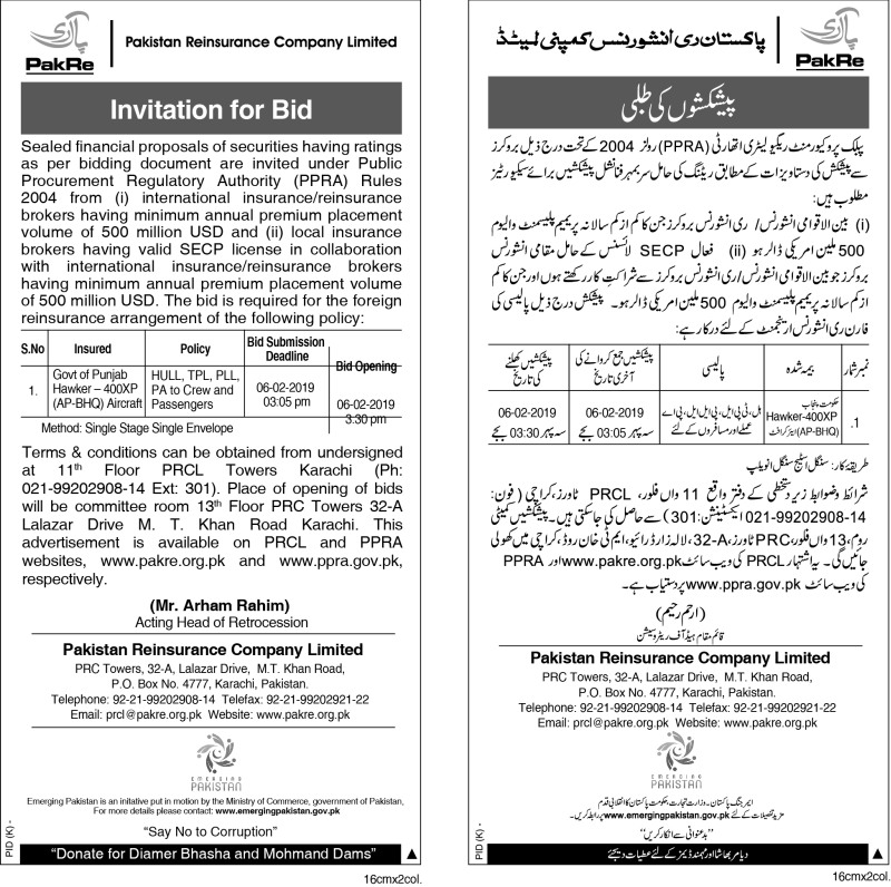 Invitation of Bids for Foreign Reinsurance of Govt of Punjab Hawaker 400XP Aircraft