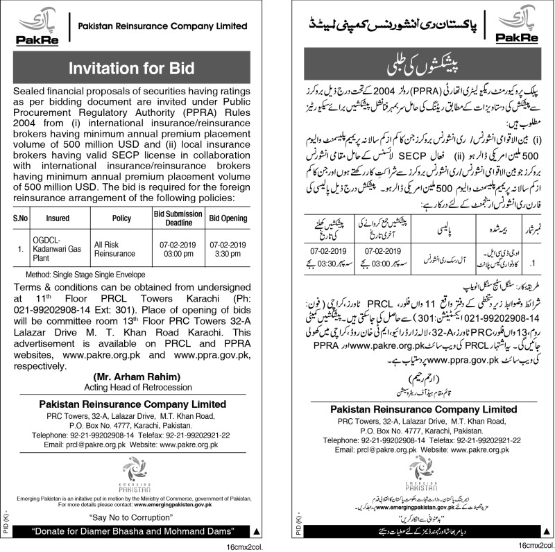 Invitation of Bids for Foreign Reinsurance of OGDCL Kadanwari Gas Plant